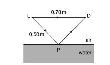 (i) The wavelength in air is \[ \lambda = \frac{v}{f} = \frac{340}{1700} = 0.20\,m. \] (ii) The reflected path length is \(LP + PD = 0.50 + 0.50 = 1.00\,m\), while the direct path length is \(0.70\,m\). The path difference is therefore \(0.30\,m\). Since \(\frac{0.30}{0.20} = 1.5\lambda\), the waves arrive at D out of phase, resulting in destructive interference.