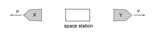 Two spaceships, $\mathrm{X}$ and $\mathrm{Y}$ move in opposite directions away from a space station. The speeds of the spaceships relative to the space station are $u$ and $v$.