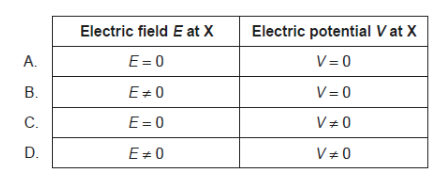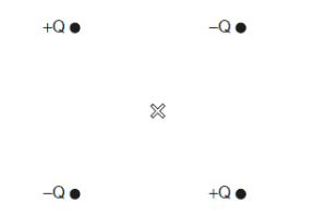 Two positive and two negative charges are located at the corners of a square as shown. Point $X$ is the centre of the square. What is the value of the electric field $E$ and the electric potential $V$ at $X$ due to the four charges?