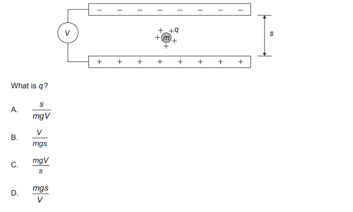 A sphere of mass m and positive charge q is at rest midway between two horizontal parallel plates separated by a distance s. The potential difference across the plates is V.