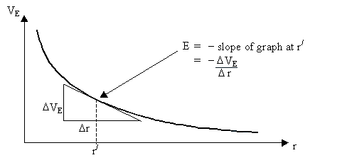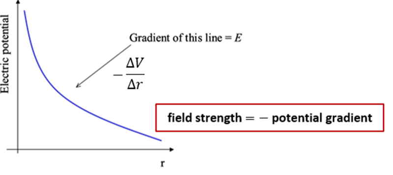 the electric field strength \( E \) as the electric potential gradient as given by \( E = – \dfrac{\Delta V_e}{\Delta r} \)