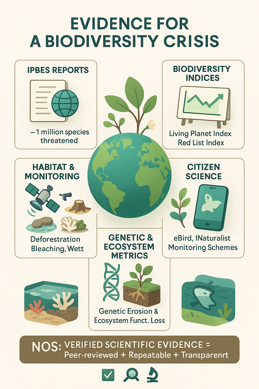 | Ecosystem Diversity | Variety of ecosystems and interactions | Deserts, savannas, coral reefs, tundra |