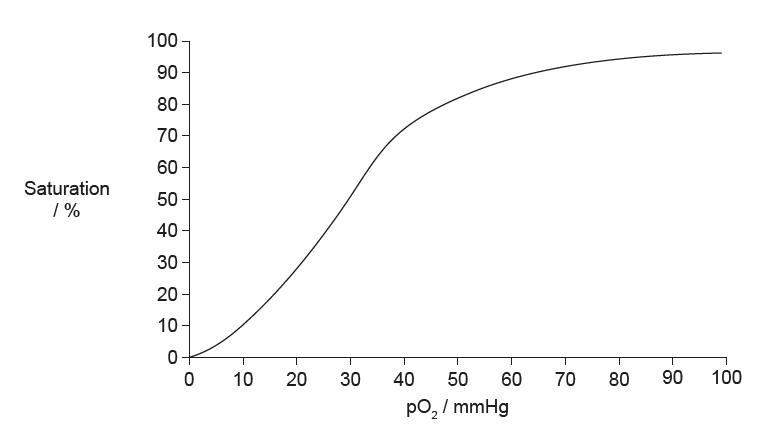• At higher pO2 values (around 70–100 mmHg), the curve begins to plateau as haemoglobin approaches full saturation.