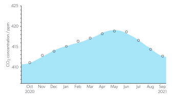 - Autumn and winter: CO₂ increases as respiration and decomposition release CO₂, and photosynthesis slows down.