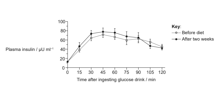 • Both sets of values are very similar at each time point, with overlapping error bars, indicating no significant difference in insulin levels before and after the study diet.