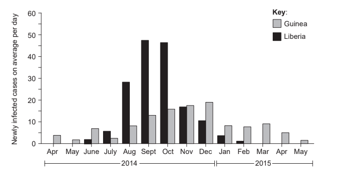 e. Epidemic starts earlier (April 2014) in Guinea than in Liberia (June 2014).