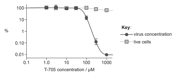 • As the concentration of T-705 increases, the virus concentration falls markedly, showing the drug is effective at reducing or inhibiting viral replication.