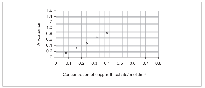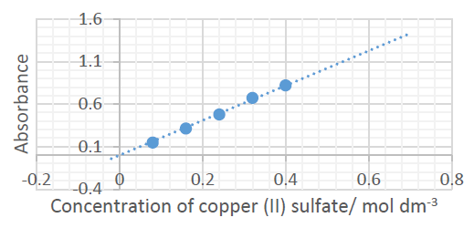 • The line should be extended beyond the range of the measured data (beyond 0.08 AND 0.32 mol dm⁻³) ✓