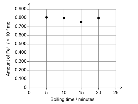 (b) The mean values from part (a) were plotted on a graph of amount of \(\text{Fe}^{2+}\) released (\(\times 10^{-3}\ \text{mol}\)) against boiling time (\(\text{minutes}\)).