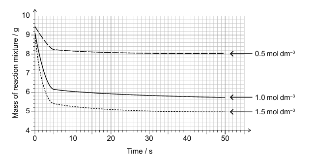 • Tangent drawn at t = 0 for 1.5 mol dm⁻³ solution ✓
