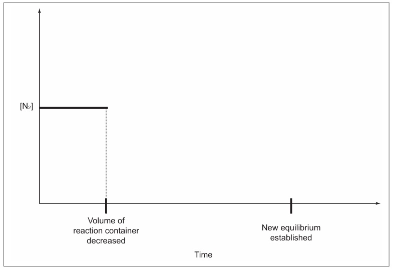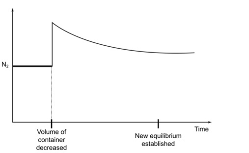 • When the volume is decreased, the concentration of \( \text{N}_2 \) increases suddenly due to compression.