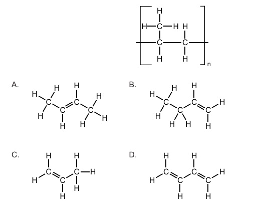 Addition polymers form when monomers with carbon-carbon double bonds undergo chain-growth polymerization. The repeating unit of the polymer reveals the structure of the original monomer. By examining the polymer’s backbone and side groups, it can be determined that the monomer must be the alkene shown in option C, as it would produce the exact repeating pattern seen in the polymer chain when its double bond opens up.