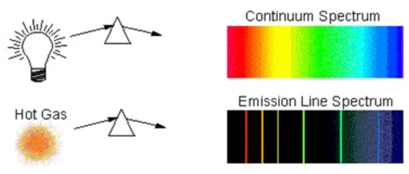 - Line spectrum: Contains only specific wavelengths. Each element produces a unique pattern — like a fingerprint. Caused by transitions between quantized energy levels in atoms.