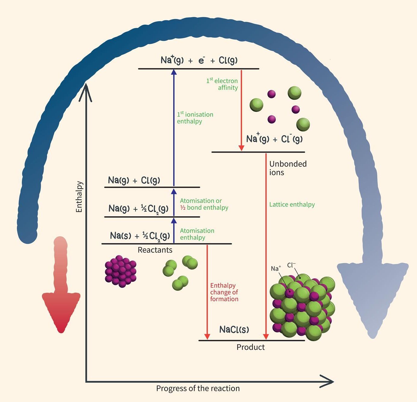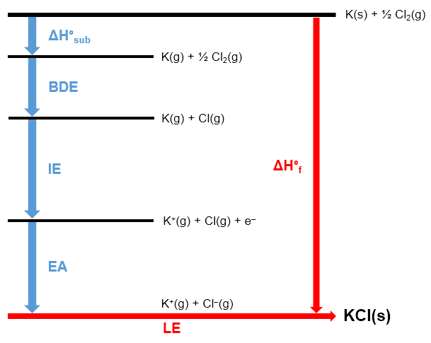 - The horizontal and stepwise path involves all the intermediate steps (atomization, ionization, electron affinity, lattice enthalpy).