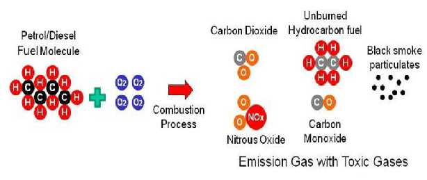 - Carbon monoxide formation: \[ \text{Hydrocarbon} + \text{O}_2 \rightarrow \text{CO} + \text{H}_2\text{O} \]