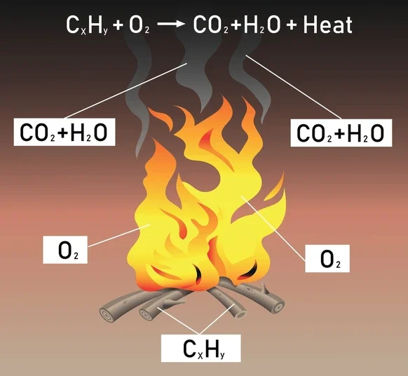 \[ \text{Hydrocarbon} + \text{O}_2 \rightarrow \text{CO}_2 + \text{H}_2\text{O} \]