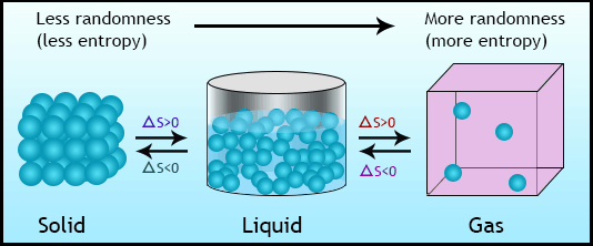 - Change of state: Entropy increases when going from solid → liquid → gas.