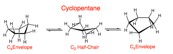 - Cyclopentane adopts a puckered envelope conformation to reduce torsional strain.