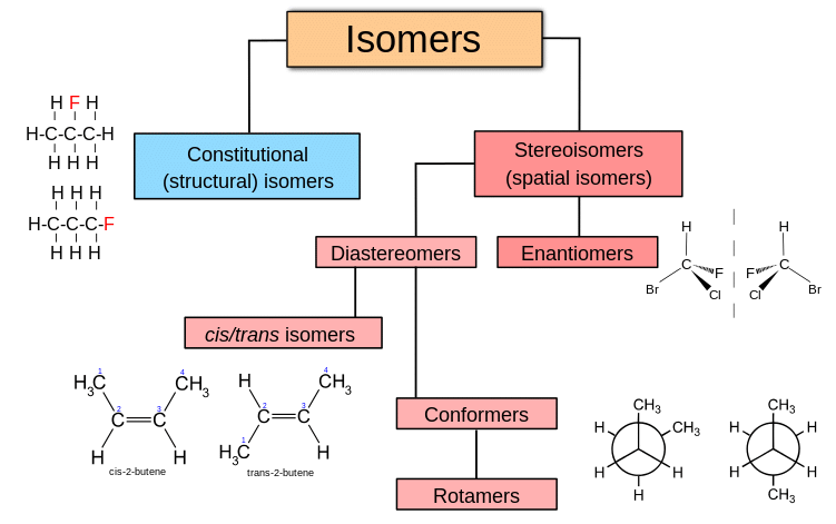- Structural isomers: Same molecular formula but different connectivity of atoms.