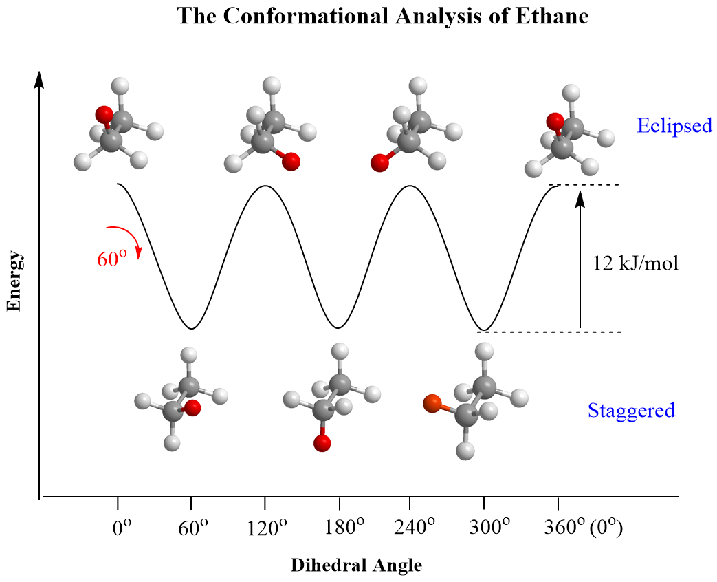 - Staggered conformation: The hydrogen atoms are 60° apart. This minimizes electron repulsion between bonding pairs of electrons. It is the most stable form.