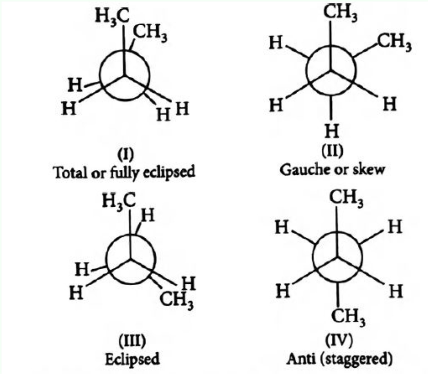 - Staggered conformation: The hydrogen atoms on adjacent carbon atoms are as far apart as possible — this is the most stable due to minimal electron repulsion.