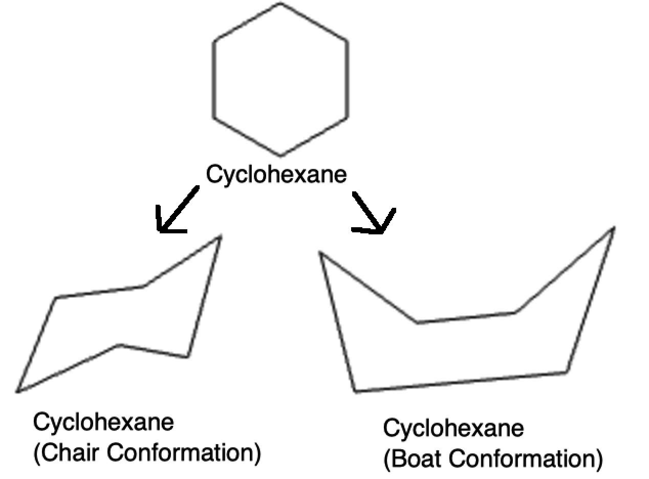 Cyclohexane is the most important example. It can adopt multiple conformations, the most stable being: