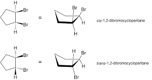 - Cis: The two groups are on the same side of the ring plane (both “up” or both “down”).