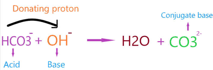 - HCO₃⁻ donates a proton (acts as acid), becoming CO₃²⁻.