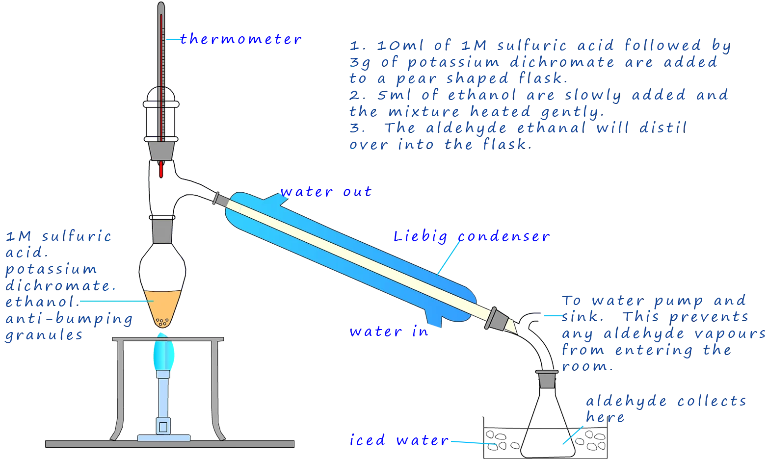 - Setup includes: round-bottom flask, condenser angled downward, thermometer, heat source.