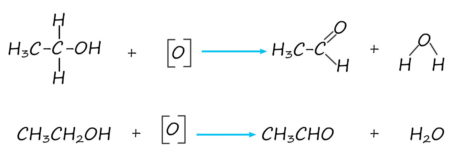 \( \text{CH}_3\text{CH}_2\text{OH} \rightarrow \text{CH}_3\text{CHO} \) (ethanol → ethanal)