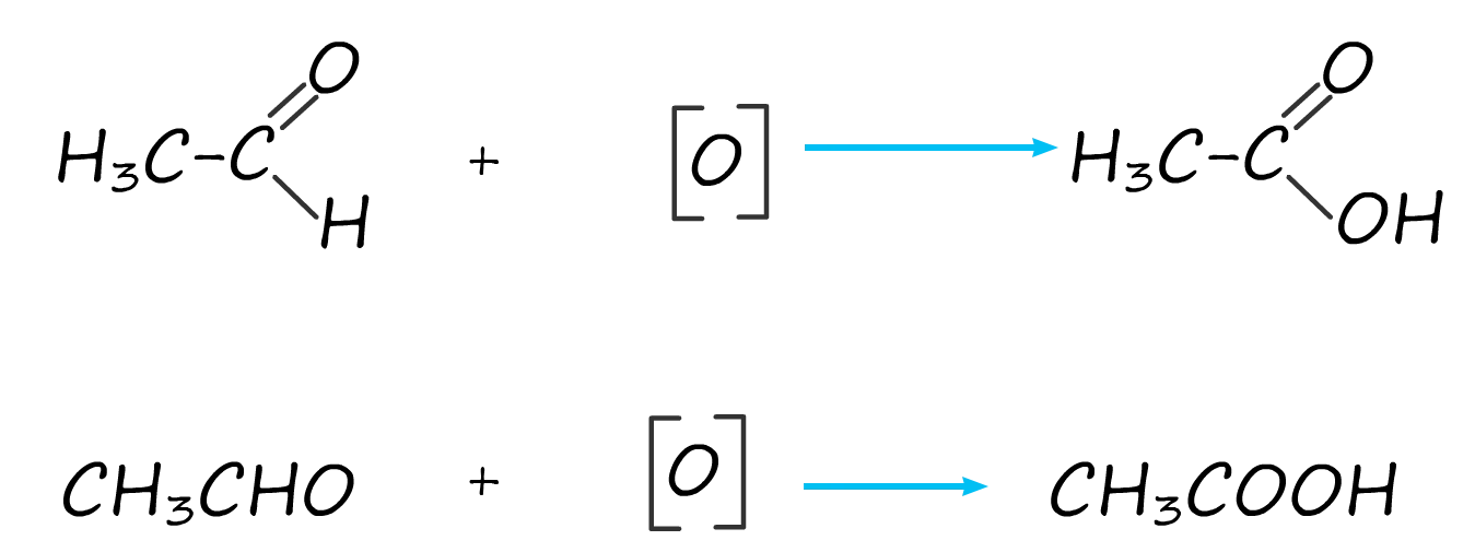 \( \text{CH}_3\text{CHO} \rightarrow \text{CH}_3\text{COOH} \) (ethanal → ethanoic acid)