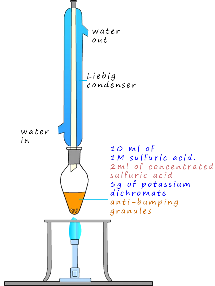 - Oxidizing agent: acidified potassium dichromate (\( \text{K}_2\text{Cr}_2\text{O}_7 \) with H2SO4)