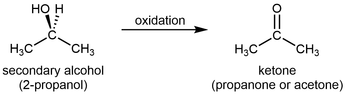 Equation: \( \text{CH}_3\text{CH(OH)}\text{CH}_3 \xrightarrow{[\text{O}]} \text{CH}_3\text{COCH}_3 \)