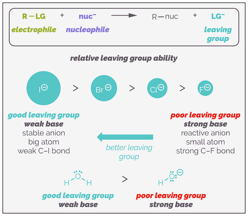 - Stability of the Leaving Group: The more stable the leaving group is as an ion in solution, the more likely it is to leave. Larger halide ions are better at stabilizing negative charge.
