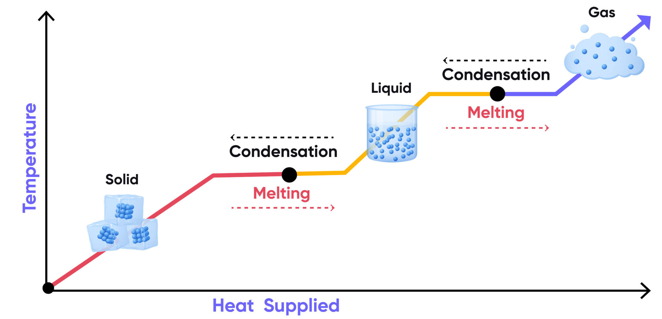 - Melting point: Temperature remains constant during the melting process. Energy goes into breaking bonds between particles.