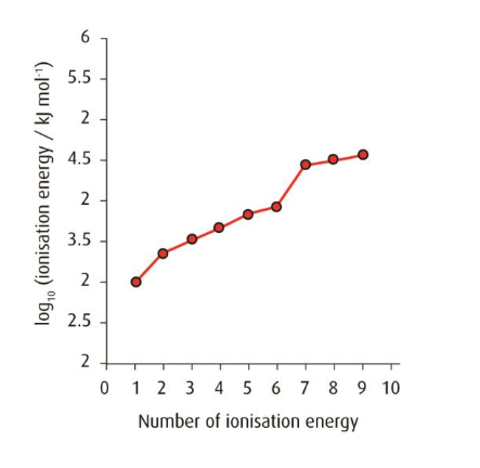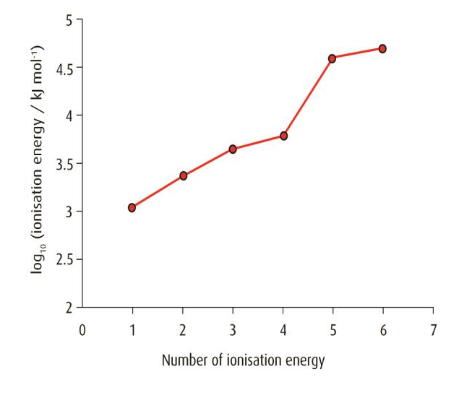 A large increase in ionization energy occurs between the 6th and 7th electrons, showing that the first six electrons are outer electrons.