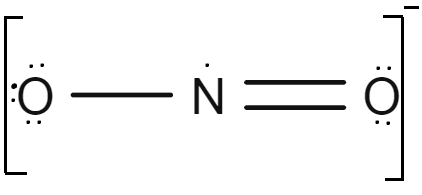 One common structure of \( \text{NO}_3^- \) has nitrogen double bonded to one oxygen, and single bonded to the other two oxygen atoms, each carrying a negative charge.