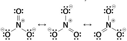 Each resonance form places a double bond between nitrogen and one of the three oxygens, with the other two bearing single bonds and negative formal charges.