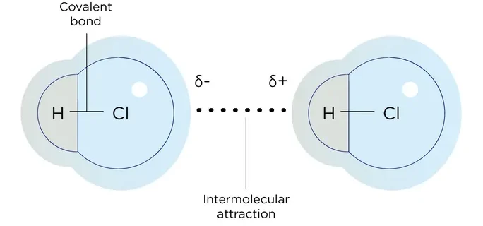 - Result from electrostatic attraction between the δ⁺ end of one molecule and the δ⁻ end of another.