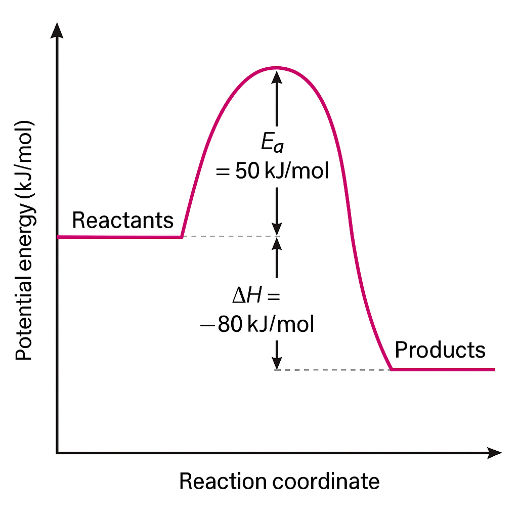 - Activation Energy (Eₐ): The minimum energy required to start the reaction; shown as the peak between reactants and products.