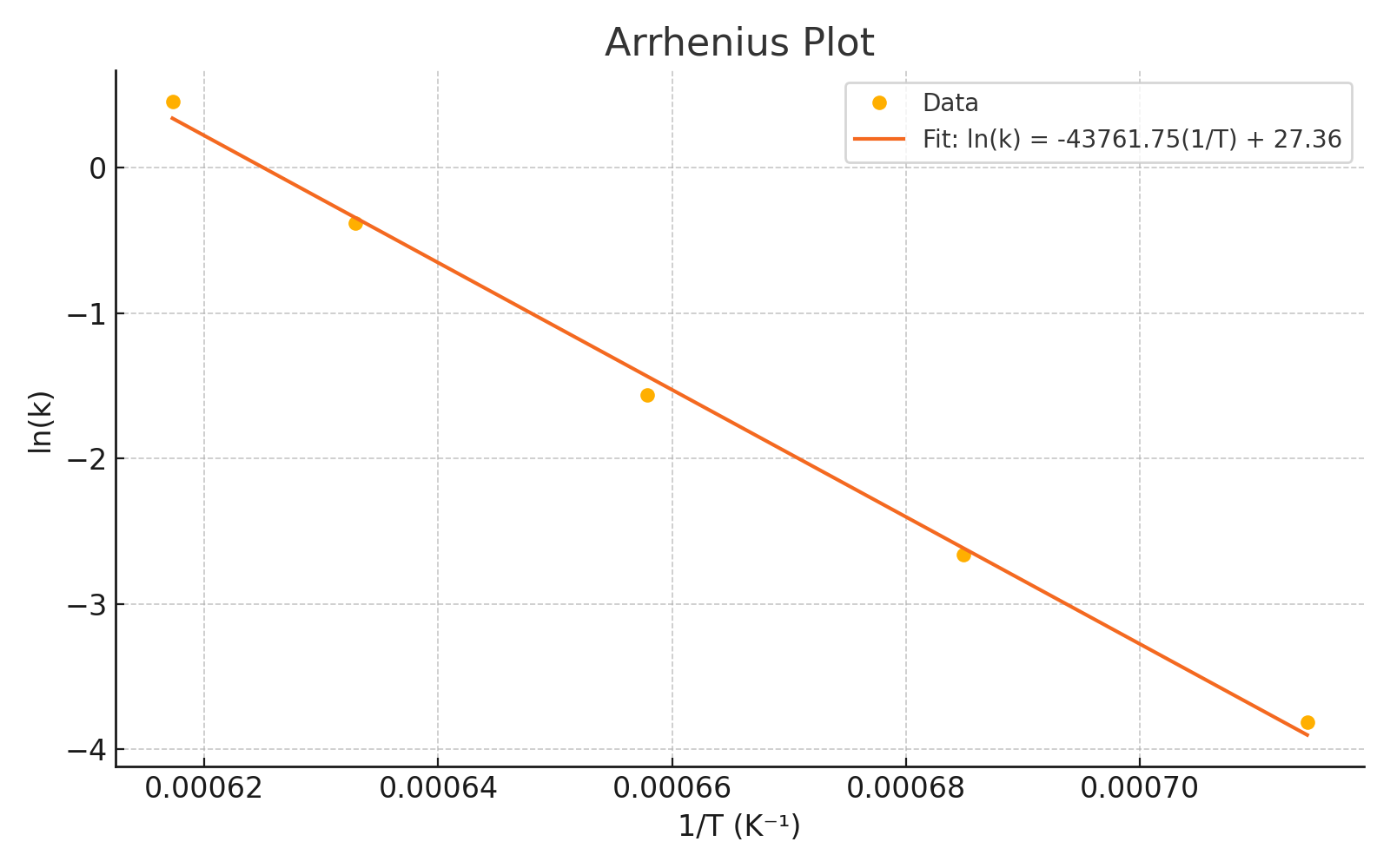 | Slope | \( -\frac{E_a}{R} \) | Used to calculate activation energy \( E_a \) |