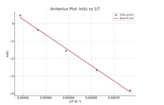 Step 2: Plot a graph of \( \ln k \) vs. \( \frac{1}{T} \). The plot is approximately linear.