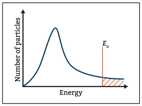 A vertical line drawn on the curve represents the activation energy \( E_a \). Only the area under the curve to the right of this line represents the particles that have sufficient energy to react (i.e., particles with energy ≥ \( E_a \)).