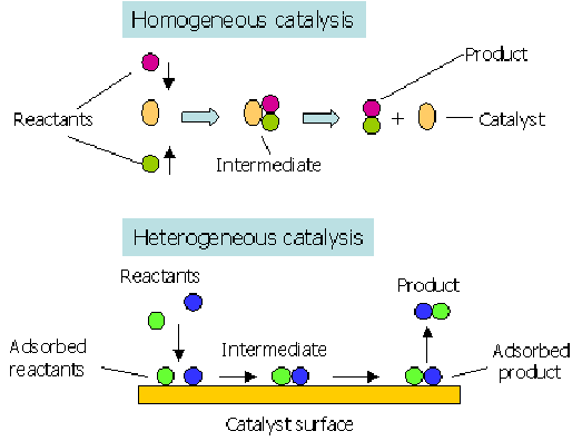 Heterogeneous Catalyst | Catalyst is in a different phase from the reactants | Iron in the Haber process; Pt in catalytic converters |