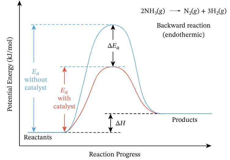 - Lower peak (dashed or separate line) for catalysed reaction
