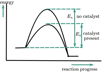 - With a catalyst: a new pathway forms with lower \( E_a \)