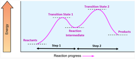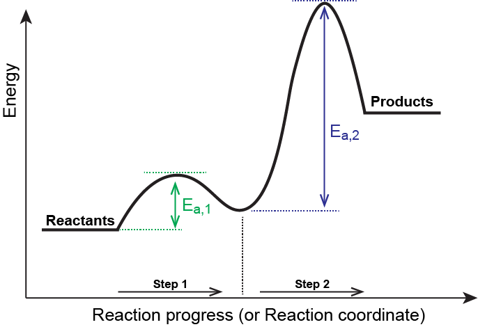 - Each step in a multistep reaction corresponds to a rise and fall in energy (peak = transition state, valley = intermediate).