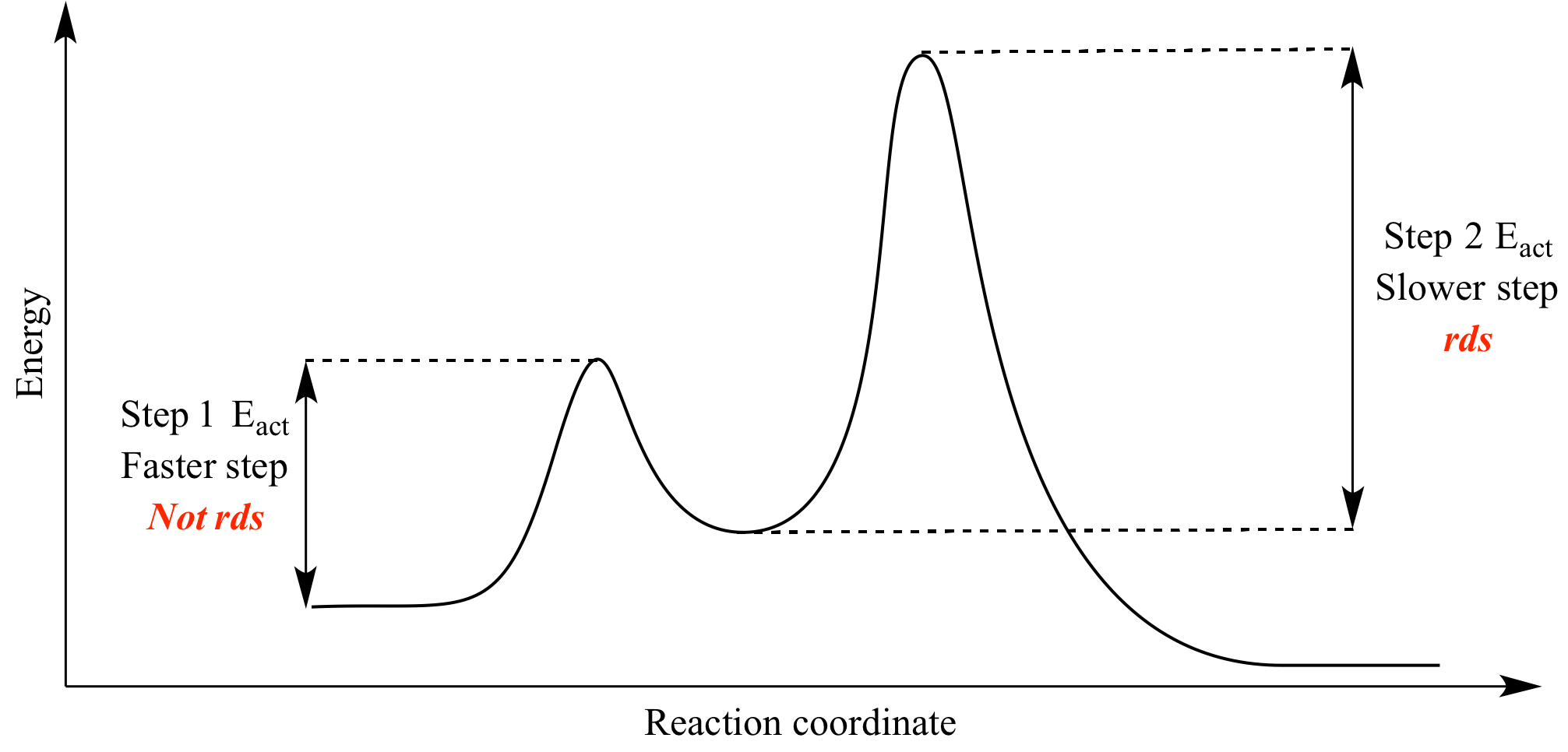 - Activation energy: Step 2 has higher activation energy than Step 1, as higher activation energy usually corresponds to a slower step.