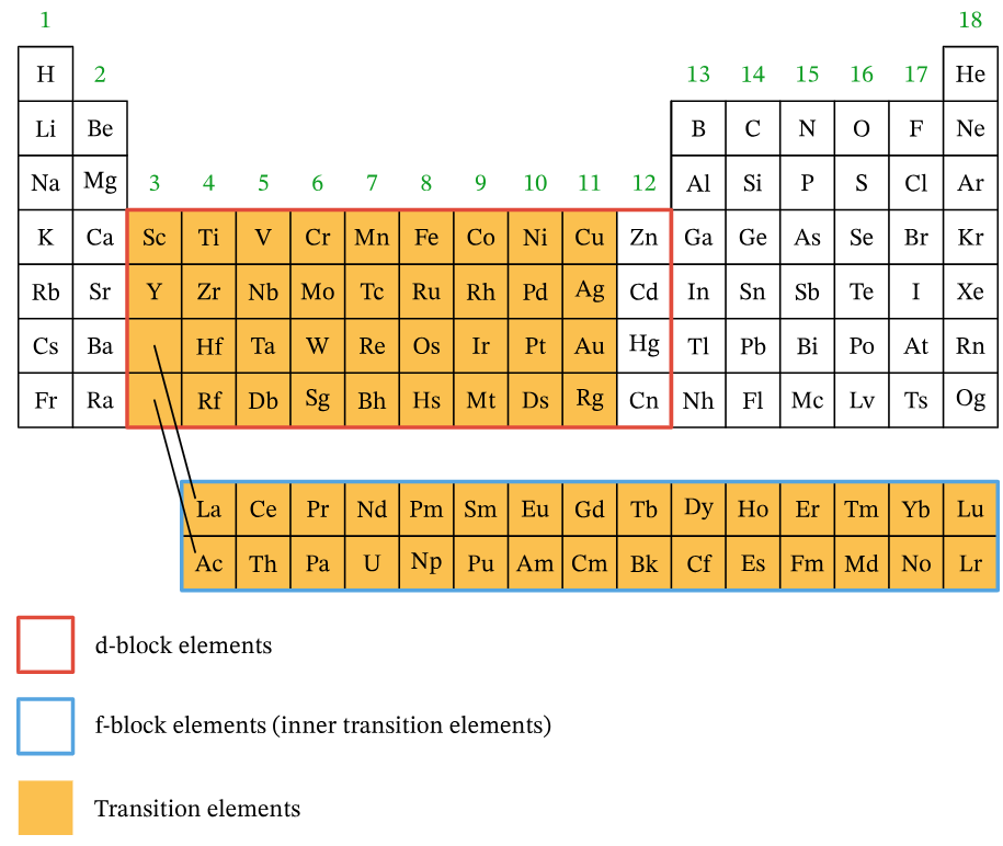 - d-block: Transition metals (Groups 3–12)