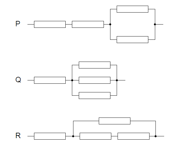 Combination P: \(R_{\!P}=2R+\left(R\parallel R\right)=2R+\frac{R}{2}=\frac{5R}{2}\)